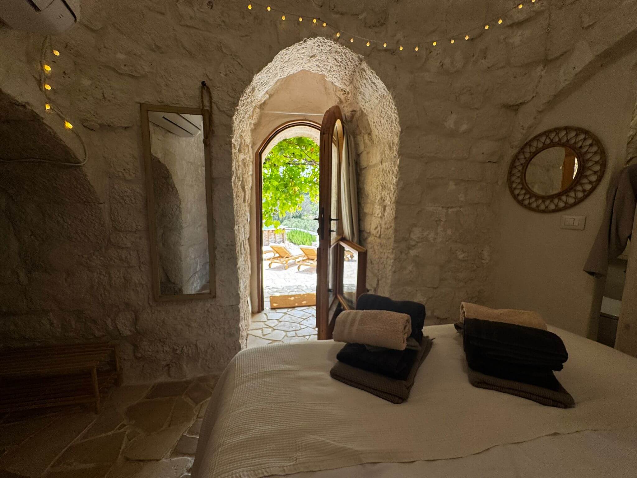 Slechts een paar stappen van het hoofdgebouw verwijderd biedt de Trullo-gastensuite authentieke Pugliese architectuur met een koepelvormig plafond, stenen muren en een privé en-suite badkamer. Een ideale plek voor wie op zoek is naar extra privacy, sfeer en stille charme.