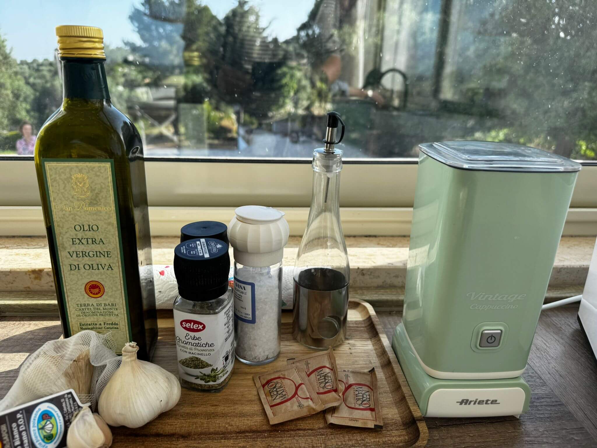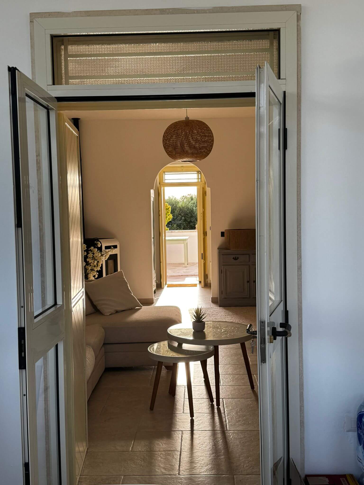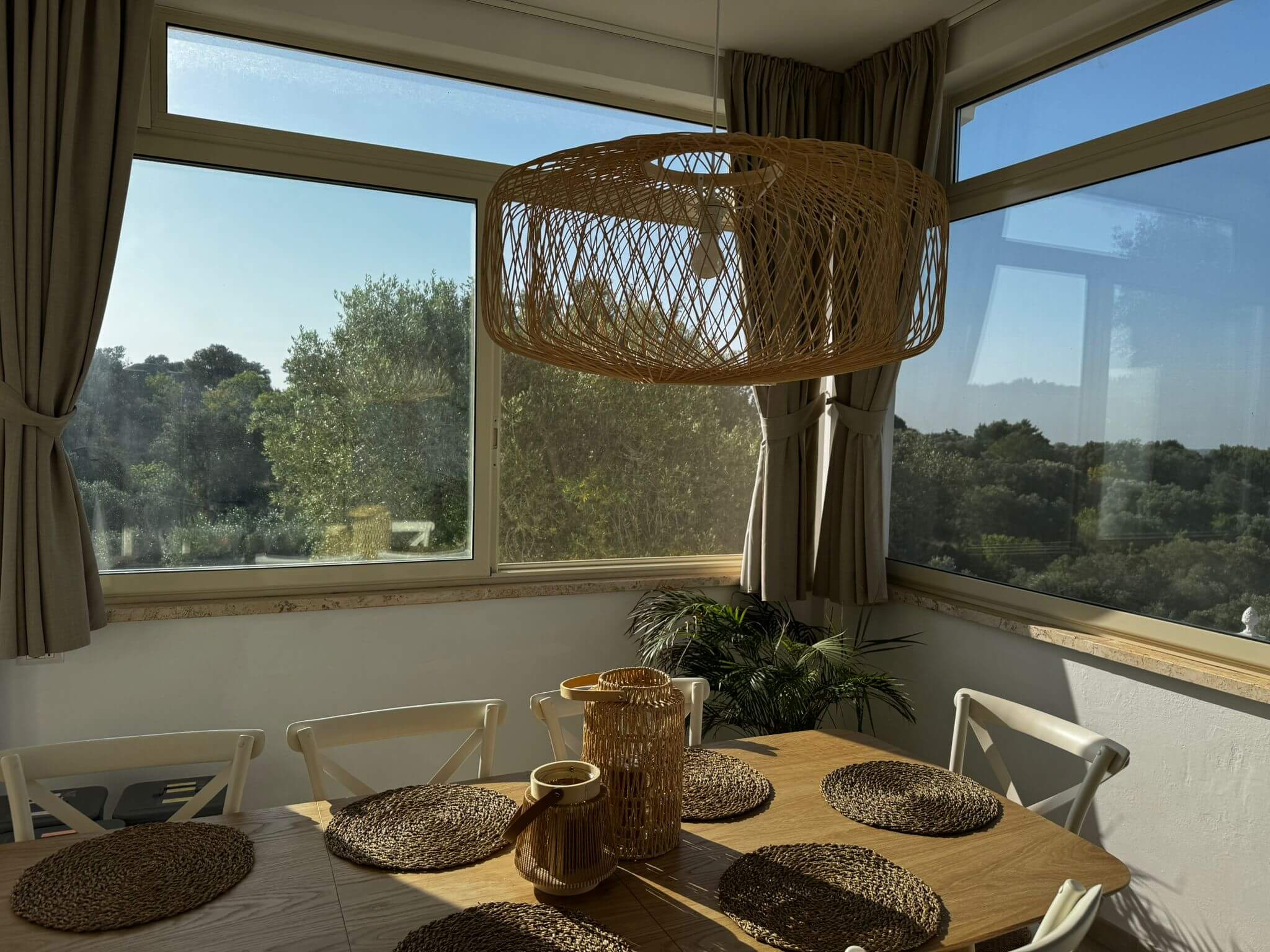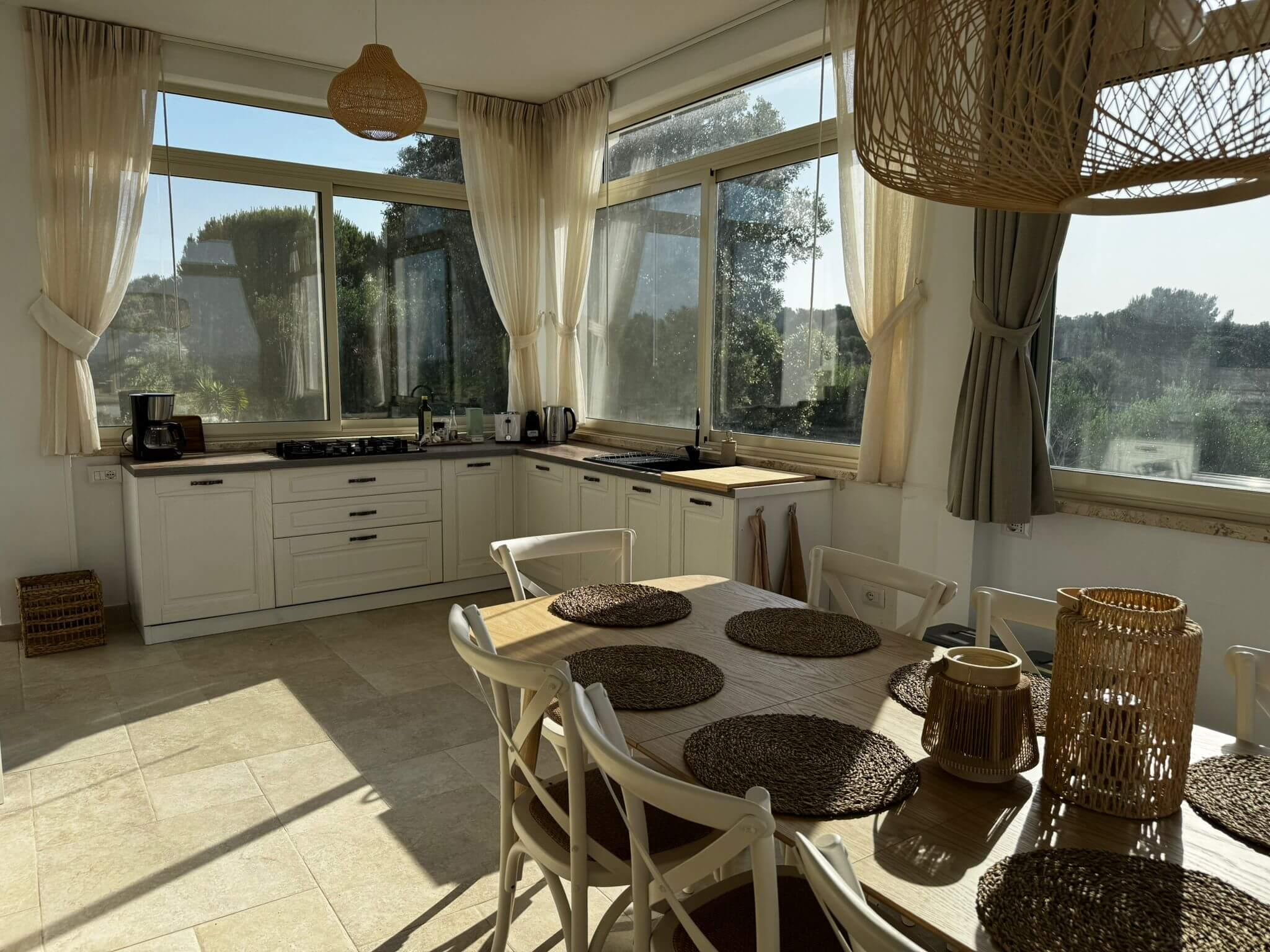De open woonkamer is licht en ruim, met een smart-tv en comfortabele zithoek in natuurlijke materialen. De volledig uitgeruste keuken bevat een oven, inductiekookplaat, Nespresso-apparaat, vaatwasser en alle benodigdheden voor ontspannen maaltijden — van ontbijt op het terras tot een lange avondmaaltijd binnen.