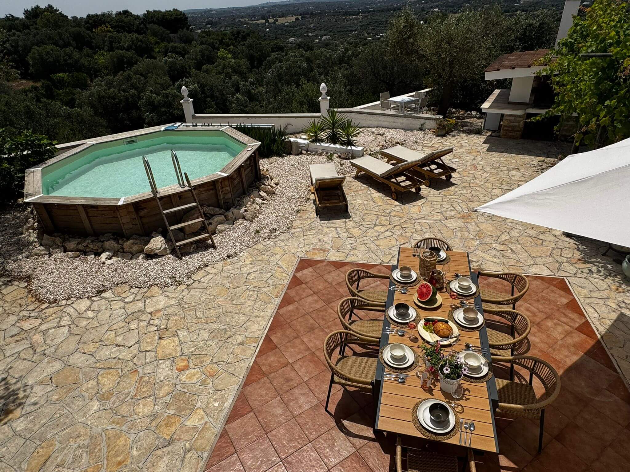 Meerdere terrassen, een eethoek onder een pergola en een traditionele pizzaoven voor onvergetelijke avonden.